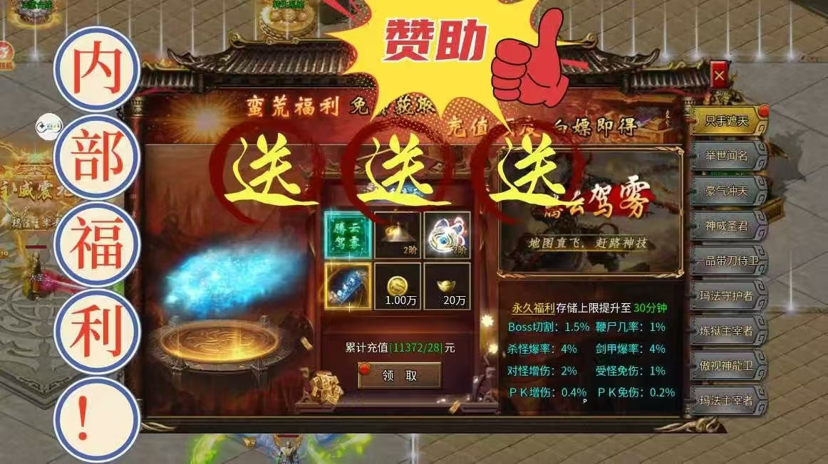 进游福利兑换码(gm888):刀刀蛮荒币上限+50001,10万蛮荒币[绑]1,法宝宝箱999,100万元宝,洪荒[烈火-重置]1,材料宝箱10,九龙云辇碎片20